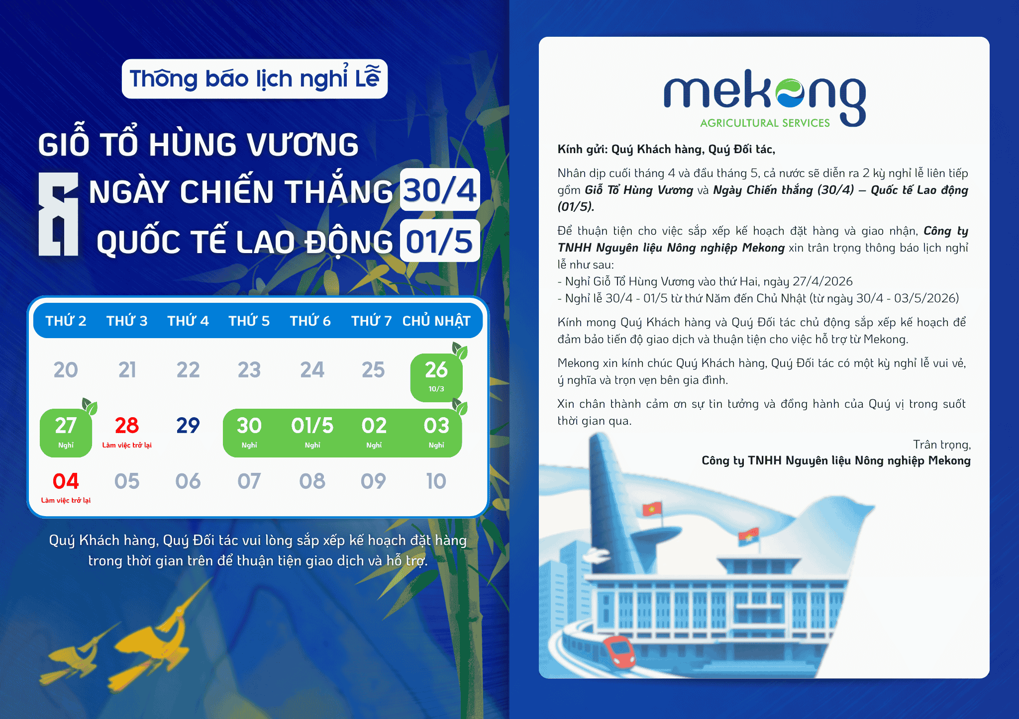 Để thuận tiện cho việc sắp xếp kế hoạch đặt hàng và giao nhận, Công ty TNHH Nguyên liệu Nông nghiệp Mekong xin trân trọng thông báo lịch nghỉ lễ như sau: