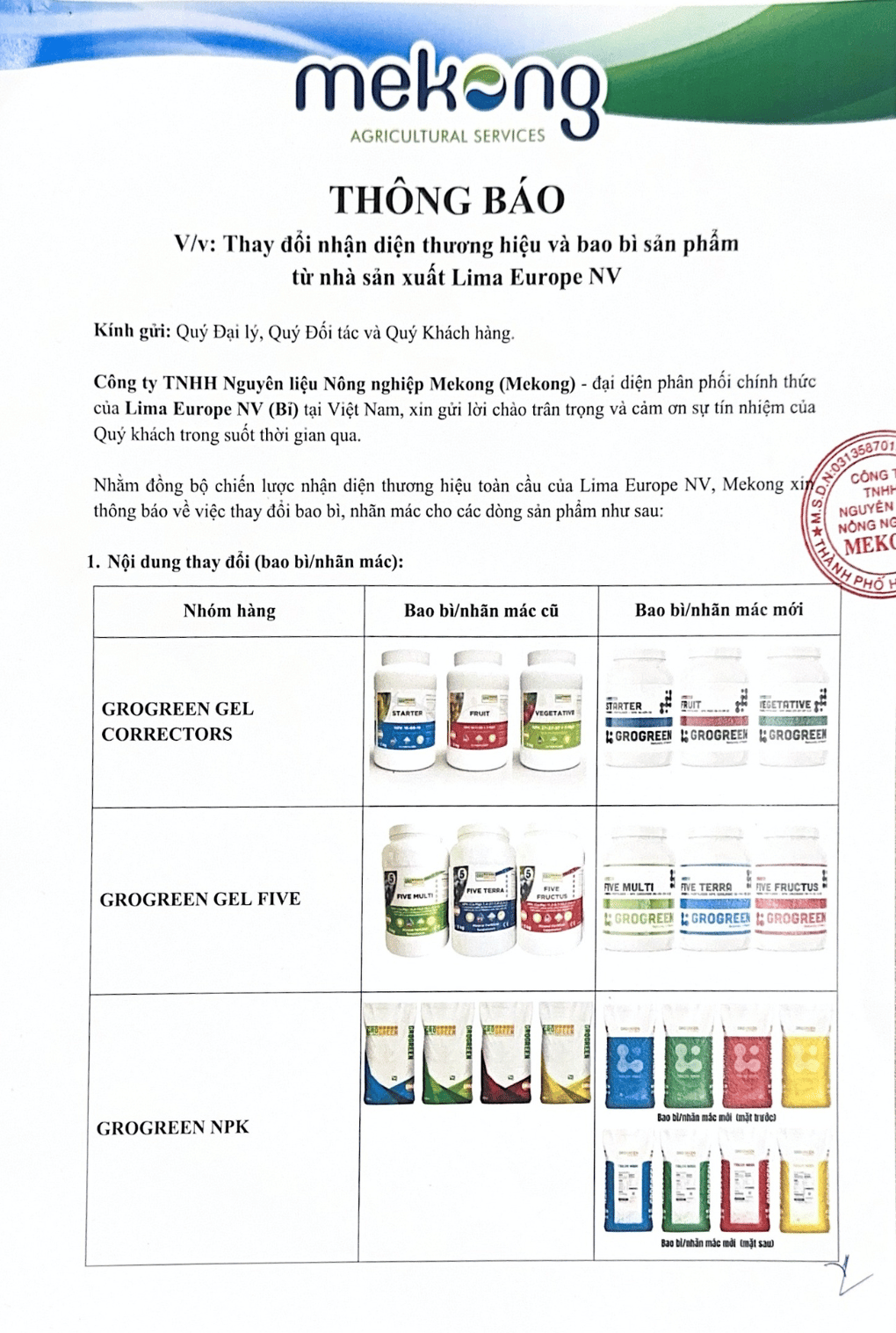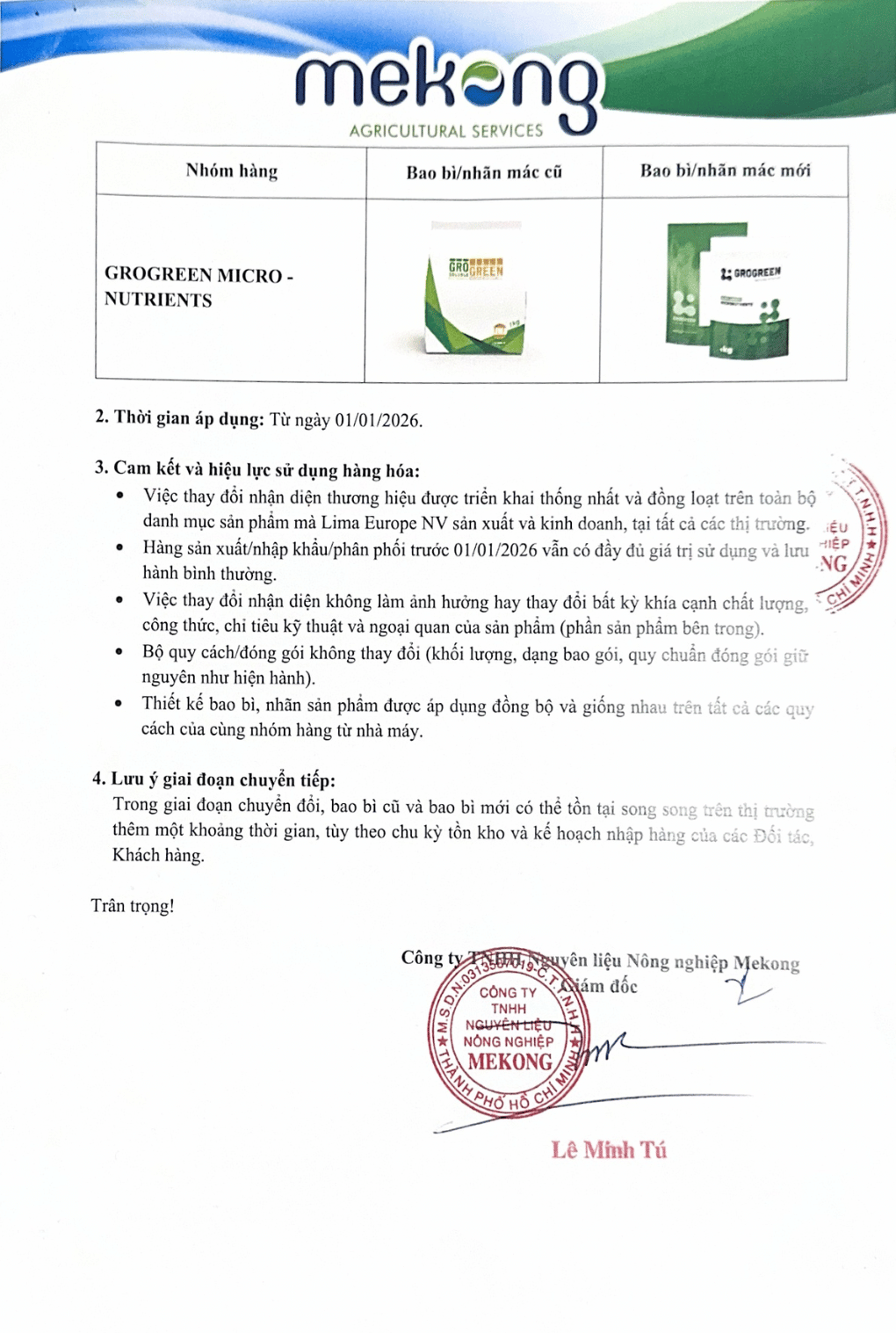 Công ty TNHH Nguyên liệu Nông nghiệp Mekong (Mekong) - đại diện phân phối chính thức của Lima Europe NV tại thị trường Việt Nam thay mặt gửi thông báo thay đổi nhận diện thương hiệu và bao bì sản phẩm mới, thời gian áp dụng kể từ ngày 01/01/2026.
