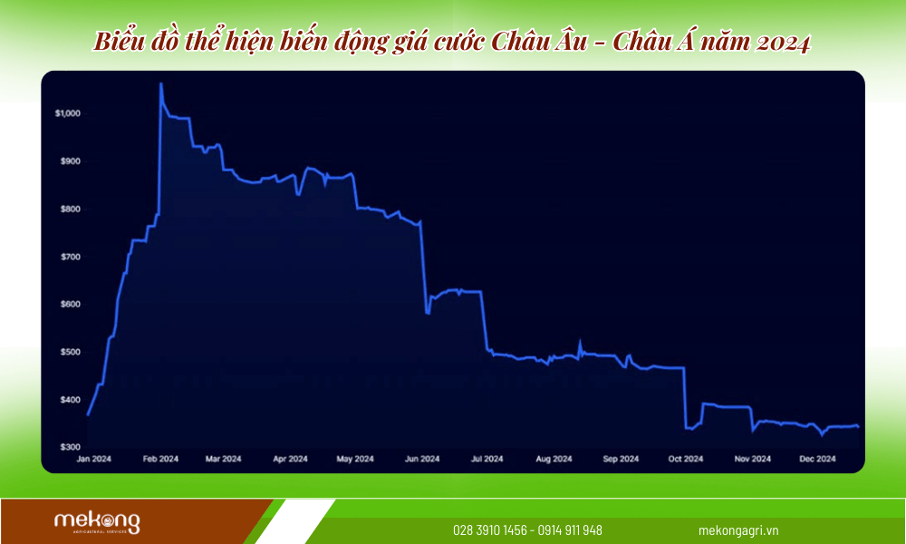 - Châu Âu –> Châu Á: Giá cước tuyến này đạt đỉnh vào quý 1 năm 2024, và chạm đáy vào quý 4 năm 2024 với giá trung bình lần lượt là ~$1000 và ~$400 theo báo cáo mới nhất của Xeneta.