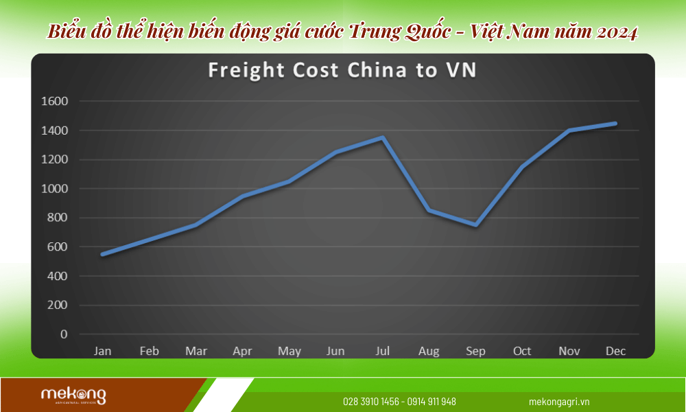 - Trung Quốc –> Việt Nam: Giá cước thấp nhất rơi vào quý 1 năm 2024 và đạt đỉnh vào quý 4 năm 2024 với giá trung bình lần lượt là ~$600 và ~$1500 theo số liệu thống kê và quan sát tổng hợp.