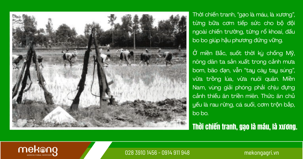 Ở miền Bắc, suốt thời kỳ chống Mỹ, nông dân ta sản xuất trong cảnh mưa bom, bão đạn, vẫn “tay cày tay súng”, vừa trồng lúa, vừa nuôi quân. Miền Nam, vùng giải phóng phải chịu đựng cảnh thiếu ăn triền miên. Thức ăn chủ yếu là rau rừng, cá suối, cơm trộn bắp, bo bo.