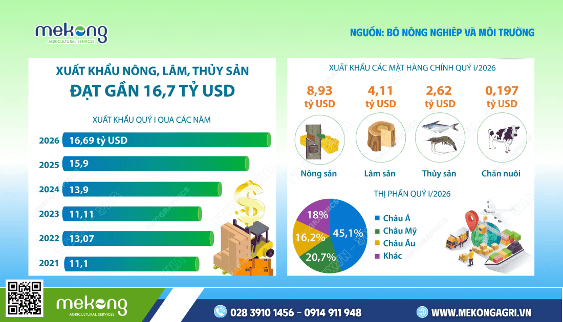 2. Xuất khẩu nông sản quý I/2026: Tổng kim ngạch xuất nhập khẩu nông, lâm, thủy sản của Việt Nam đạt 16,69 tỷ USD, tăng 5,9% so với cùng kỳ năm trước trong bối cảnh giá nhiều mặt hàng giảm